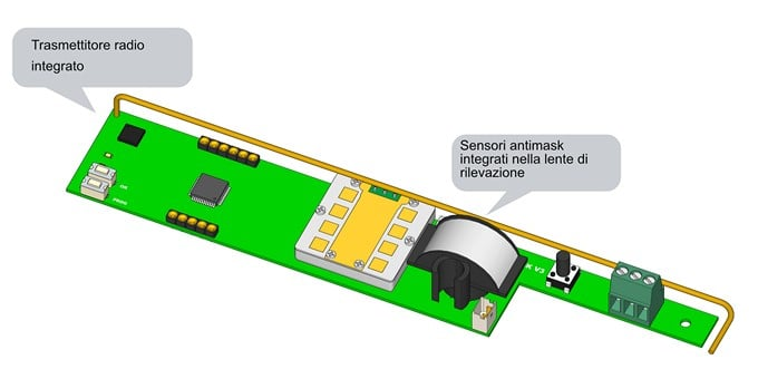 - Doppia tecnologia microonde (24 GHz) e infrarossi (piroelettrico digitale) con compensazione in temperatura (l'infrarosso diventa più sensibile nei climi caldi, meno al freddo, per mantenere un livello di rilevazione adeguato)