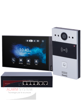- Kit formato da: AK-R20A postazione esterna da parete del videocitofono con telecamera da 2 Mpx HD, AK-S562-S monitor interno da parete con schermo TFT LCD da 7" e switch PoE standard